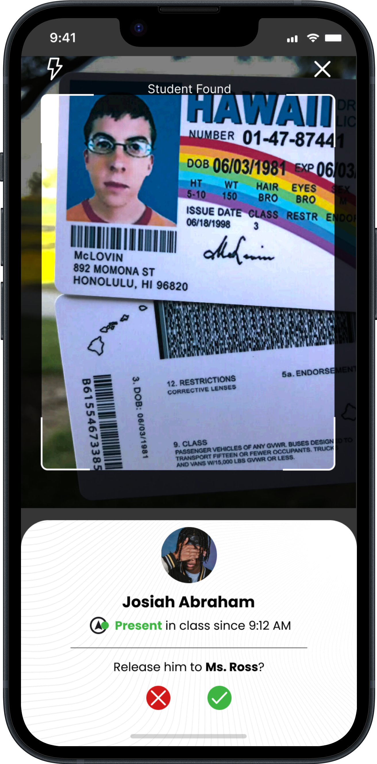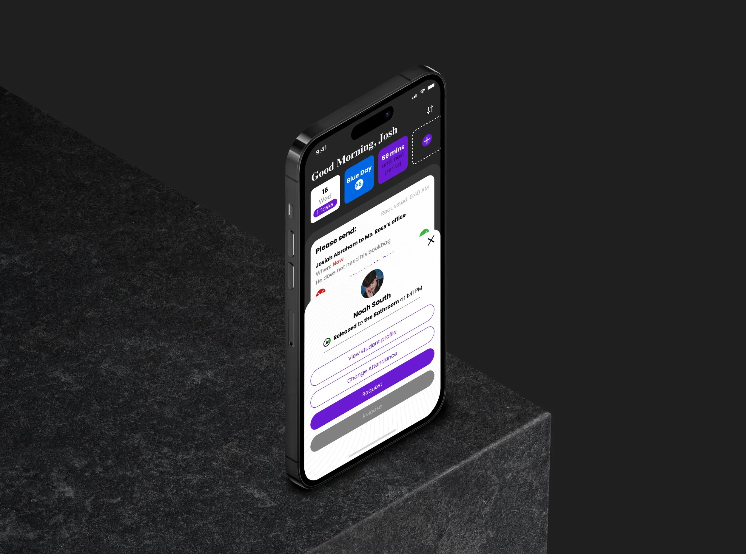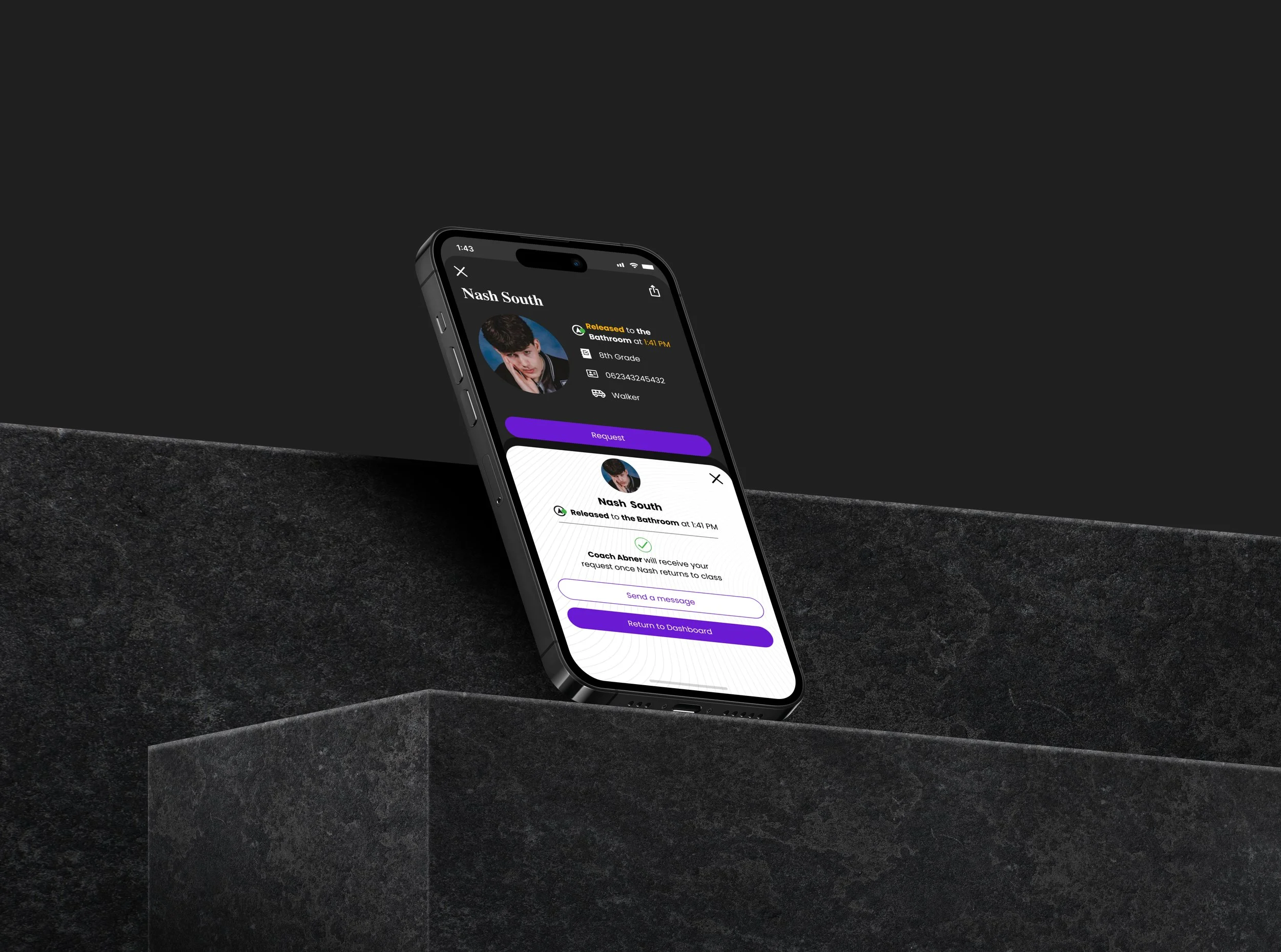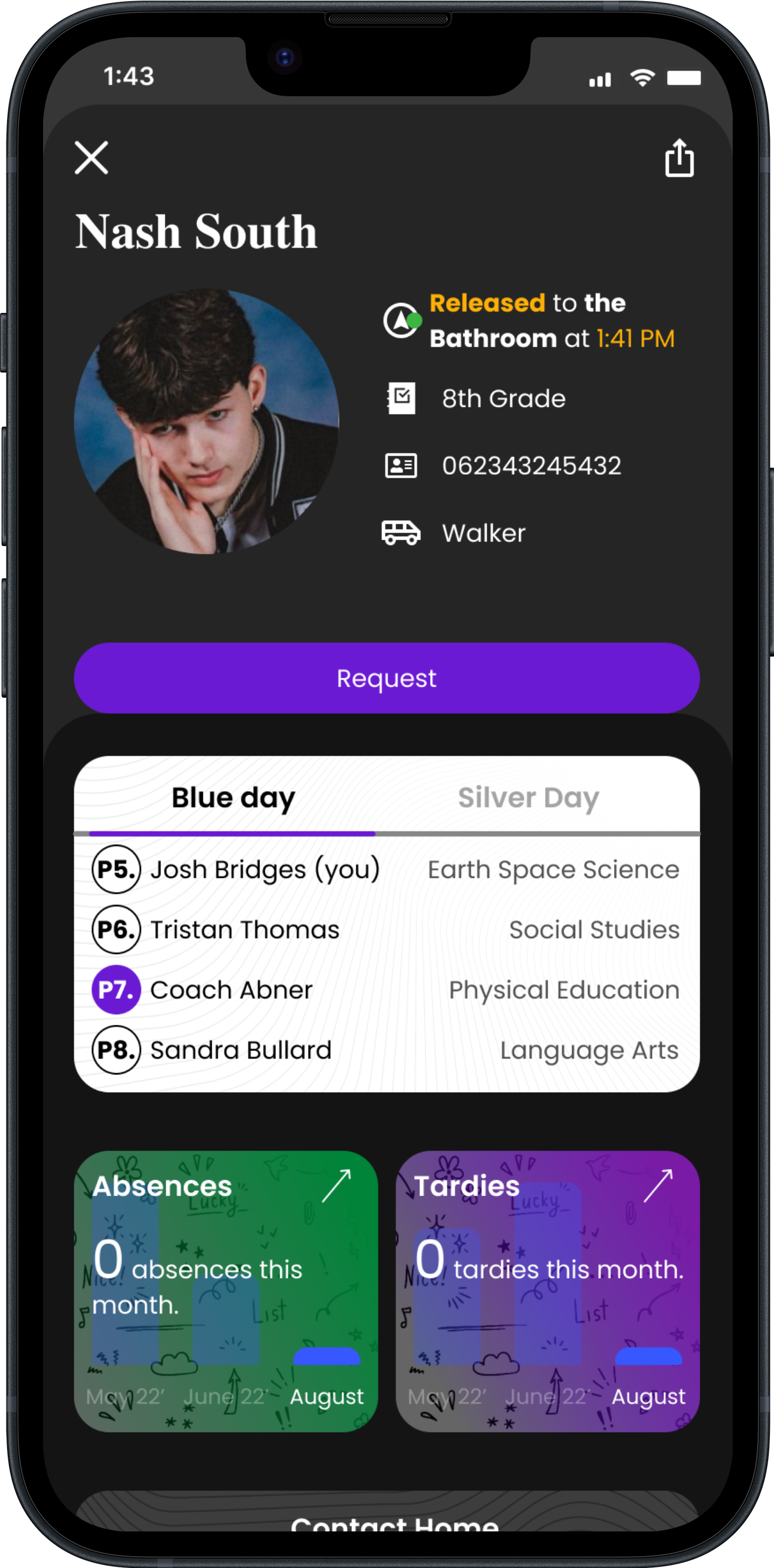 Once on the dashboard of the application, Teachers can swipe left to access the camera with which they can use to scan student’s ID Badges to release them for bathroom usage, administrative calls, or other extracurricular engagements. Alternatively, requests for students can be sent by administrators or other teachers.