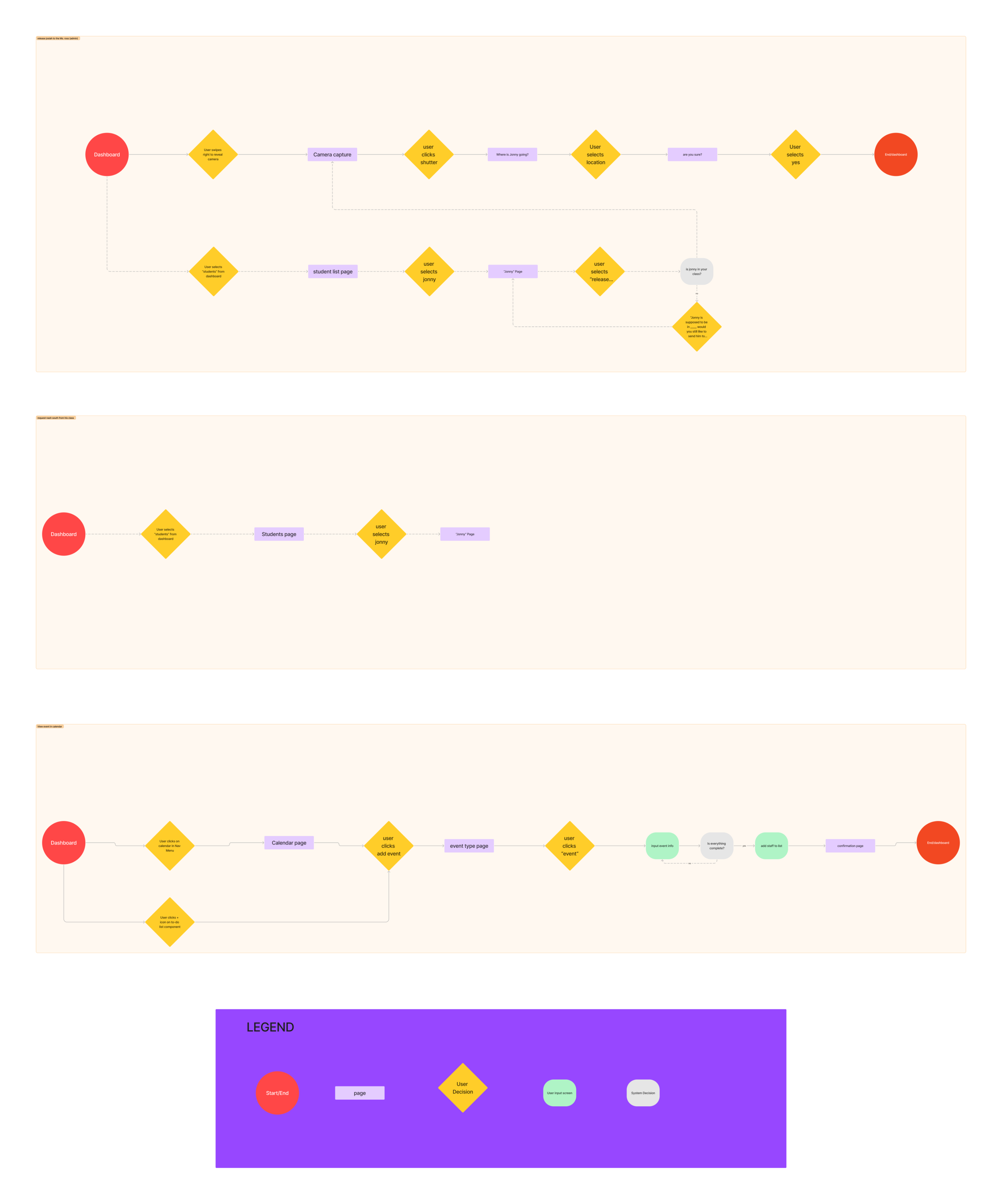 The 3 tasks mapped out in this User-Flow were (1) releasing a student to an administrator at request, (2) requesting a student from another classroom to your class, (3) view event details page from the calendar.