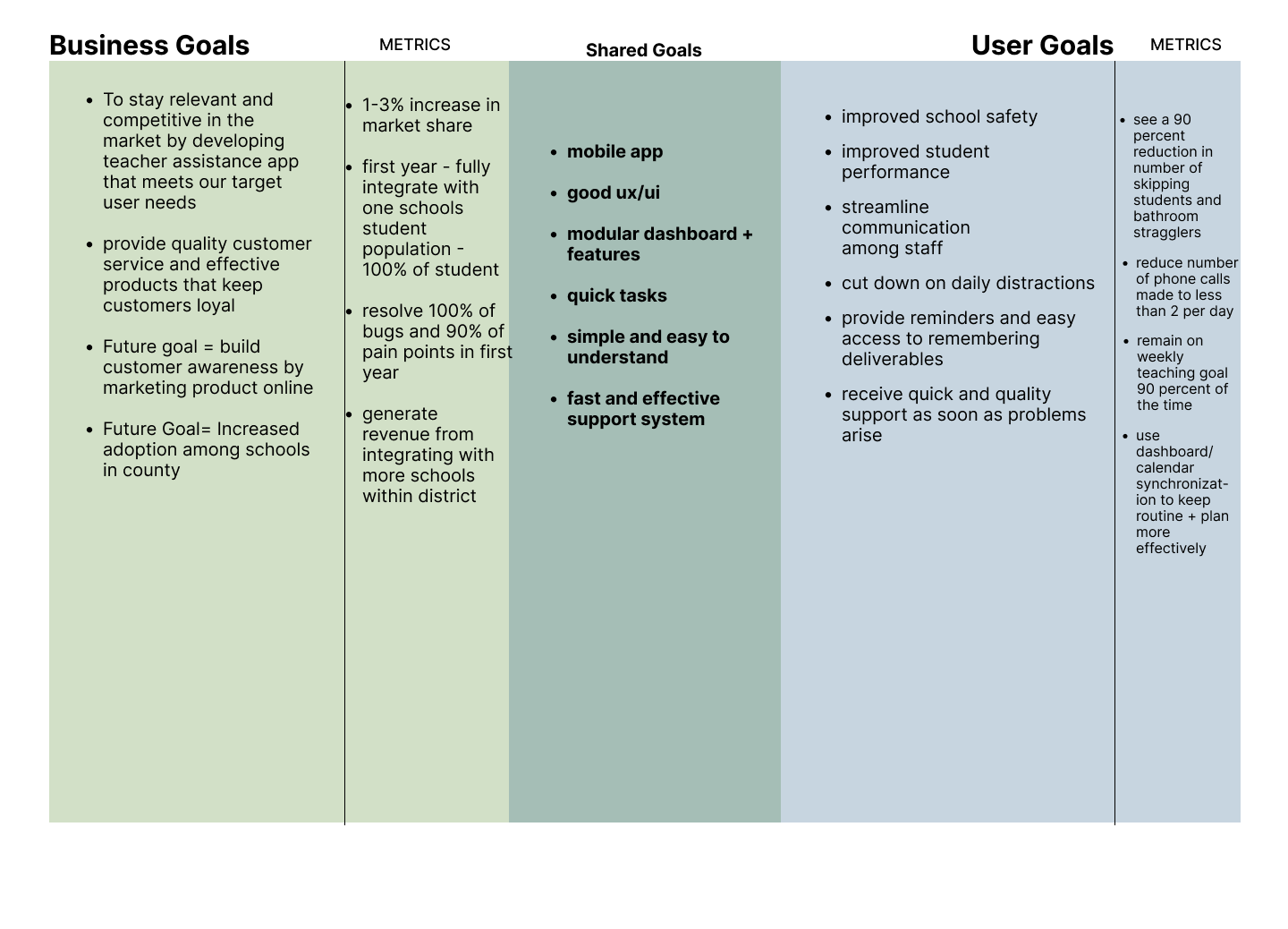 Next, User goals (by way of the persona profile) was compared against the perceived business goals, with metrics also considered. Six shared goals were the result of this comparison; a mobile application, good ui designs, modular dashboard and features, quick tasks, simple and easy to understand design, and fast and effective support teams.