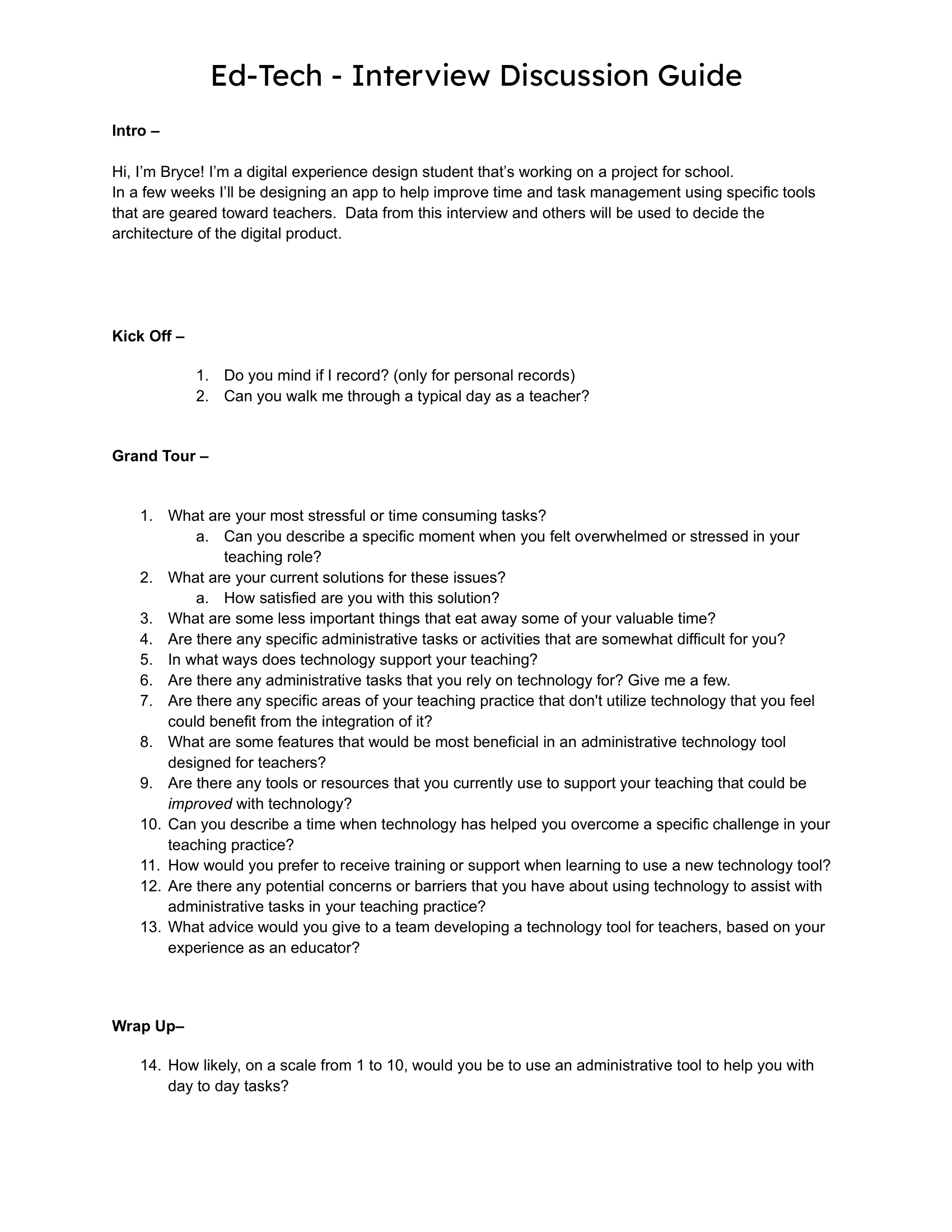 Following the competitive analysis, I needed to gain more specific insights through interviews. Using the Research objectives from the User Research Plan, I determined what information was a priority within the project and then transformed those research questions into interview questions via an Interview Discussion Guide. The target audienece for these questions were teachers in schools that allowed unsupervised student movement such as US middle and high schools.