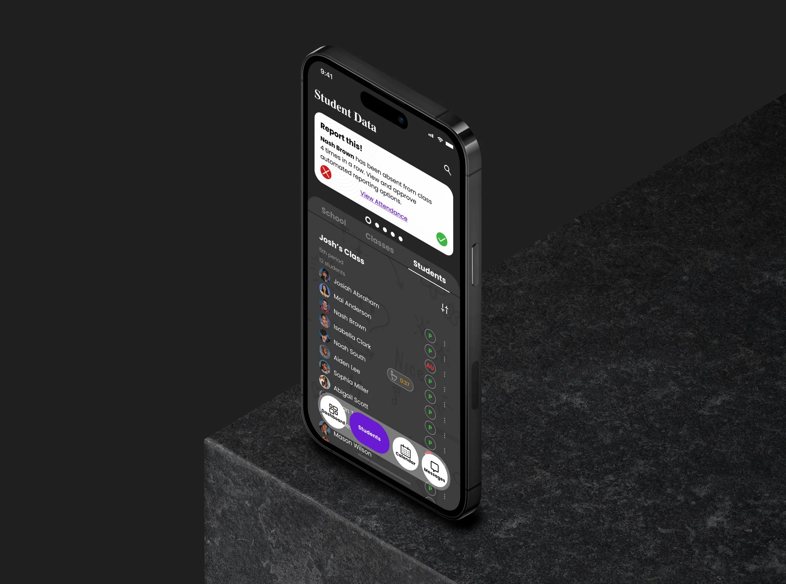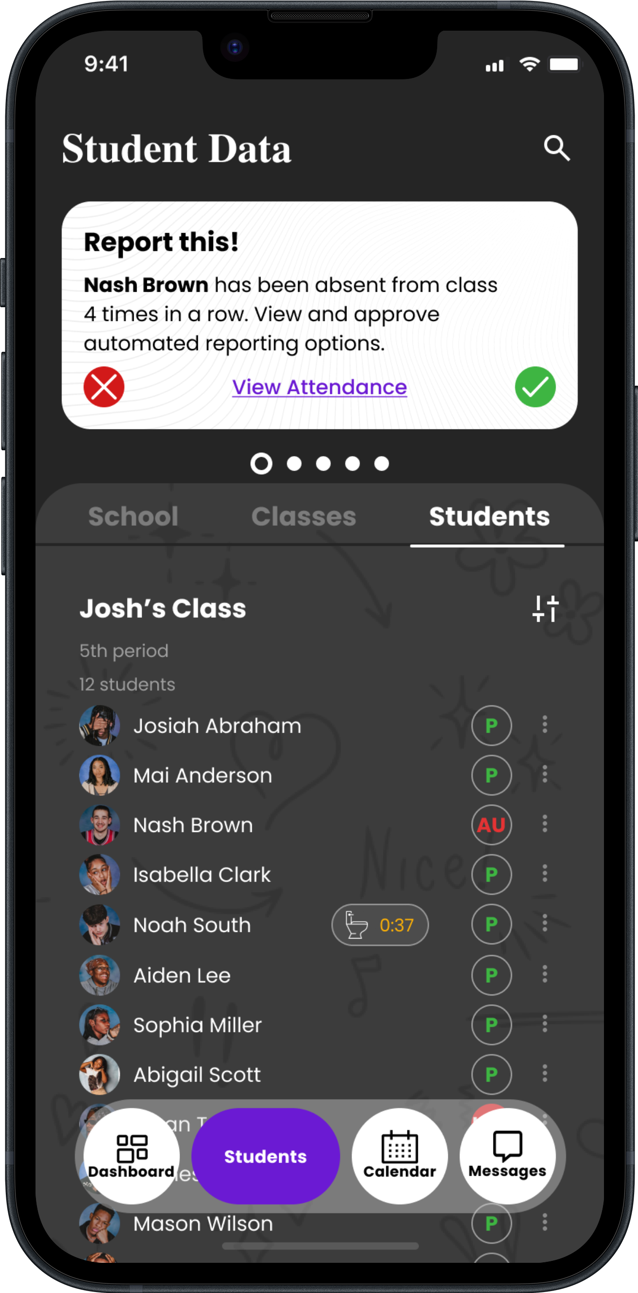 The app was also outfitted with full functionality for teachers to quickly take attendance at the start of every period. Teachers can do this by manually clicking the drop down menu to change each students status to present, tardy, or absent. Alternatively, teachers can use the camera function to quickly mark students in.